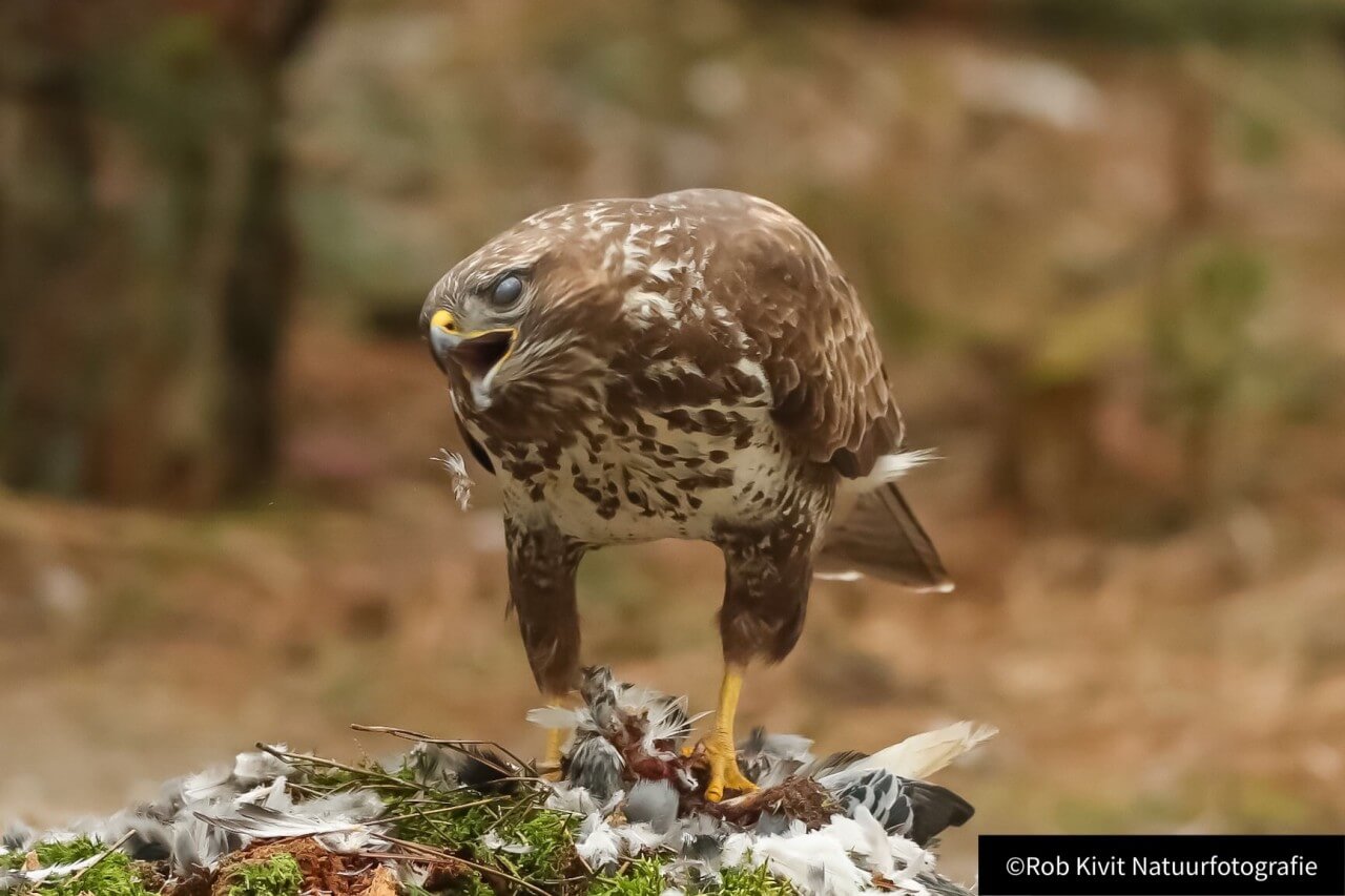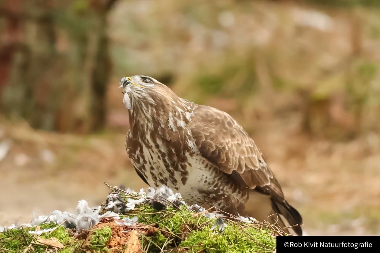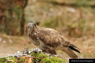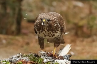 De veren vlogen werkelijk alle kanten op totdat de minder fortuinlijke duif uiteindelijk zelf aan de beurt was. Dit schouwspel duurde ongeveer zo'n 20-30 minuten waarna de buizerd moe maar voldaan voor het wijde luchtruim koos. Na een half uur kwam de wederhelft van het koppeltje buizerds poolshoogte nemen bij de restanten van de duif maar omdat wij iets te snel en ongeduldig waren met het nemen van foto's nam deze al snel de kuierlatten, helaas ! Voor de rest van de dag bleef het rustig. Samenvattend zoals gewoonlijk toch weer een erg leuke fotodag gehad met als hoogtepunten; het koppeltje buizerds, de kuifmees, de kikkers, de snacks en mogelijk een zanglijster die al weer vertrokken was voordat wij met onze ogen konden knipperen.