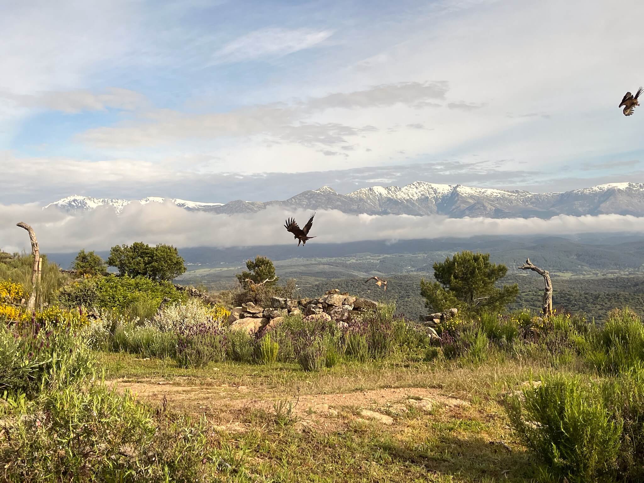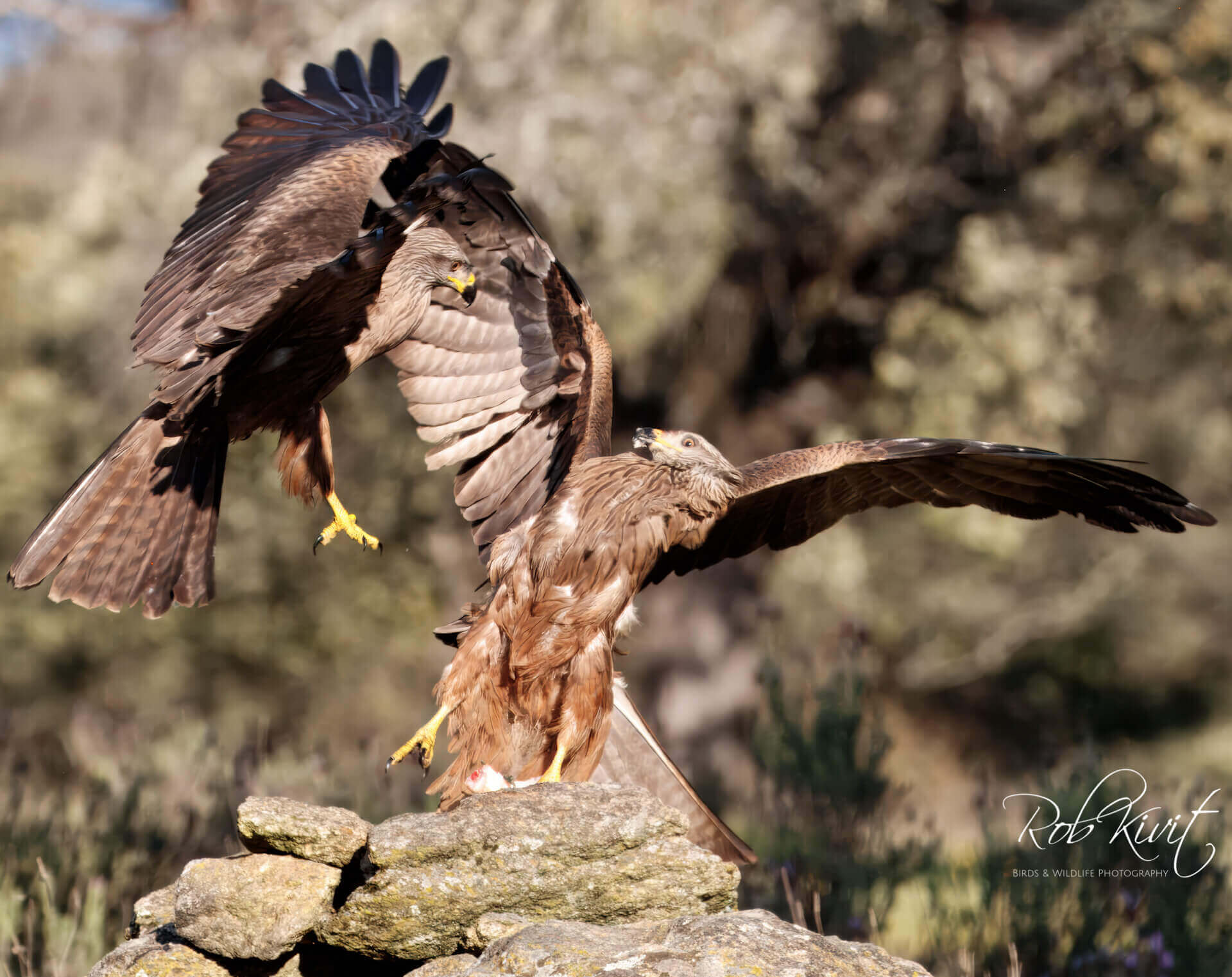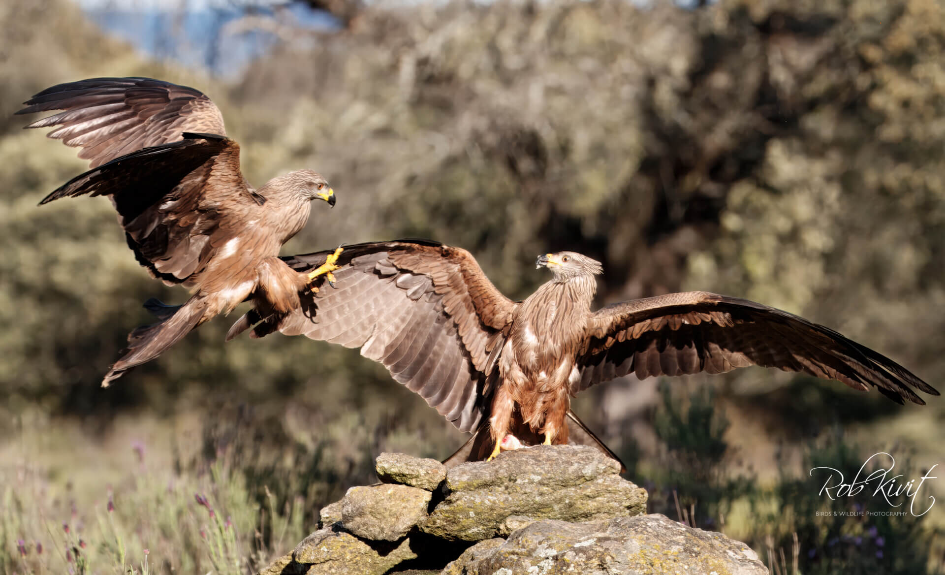 Zoals bij de meeste hutten het geval was stond ook hier de paarse lavendel en gele brem in volle bloei. Een prachtig decor als achtergrond voor het maken van mooie vlucht foto’s van vechtende kites en een paartje blauwe eksters. We zaten nog maar net in de hut of de eerste wouwen scheerden al over de hut. Dat blijft zo ongeveer voor een uur totdat het lokvoer opgegeten is en de kites zich steeds meer terugtrekken in de nabij gelegen bomen. Naast de zwarte wouwen waren ook nog rode wouwen aanwezig. Een mooi schouwspel om te zien maar doordat ze zo beweeglijk zijn en nauwelijks op de grond landen is het best wel lastig om goede vlucht foto’s te maken. Gelukkig zaten er nog een aantal acceptabele foto’s tussen.