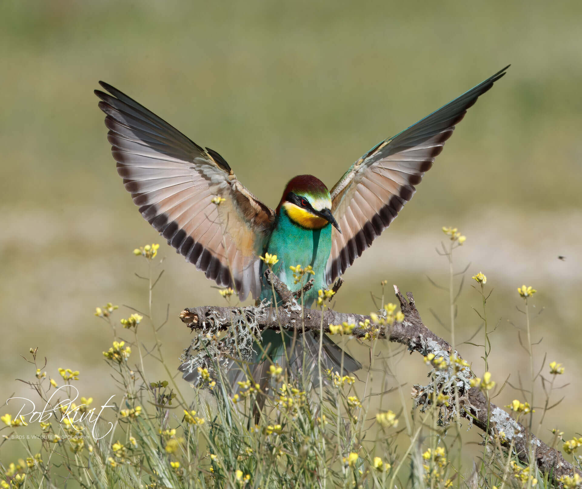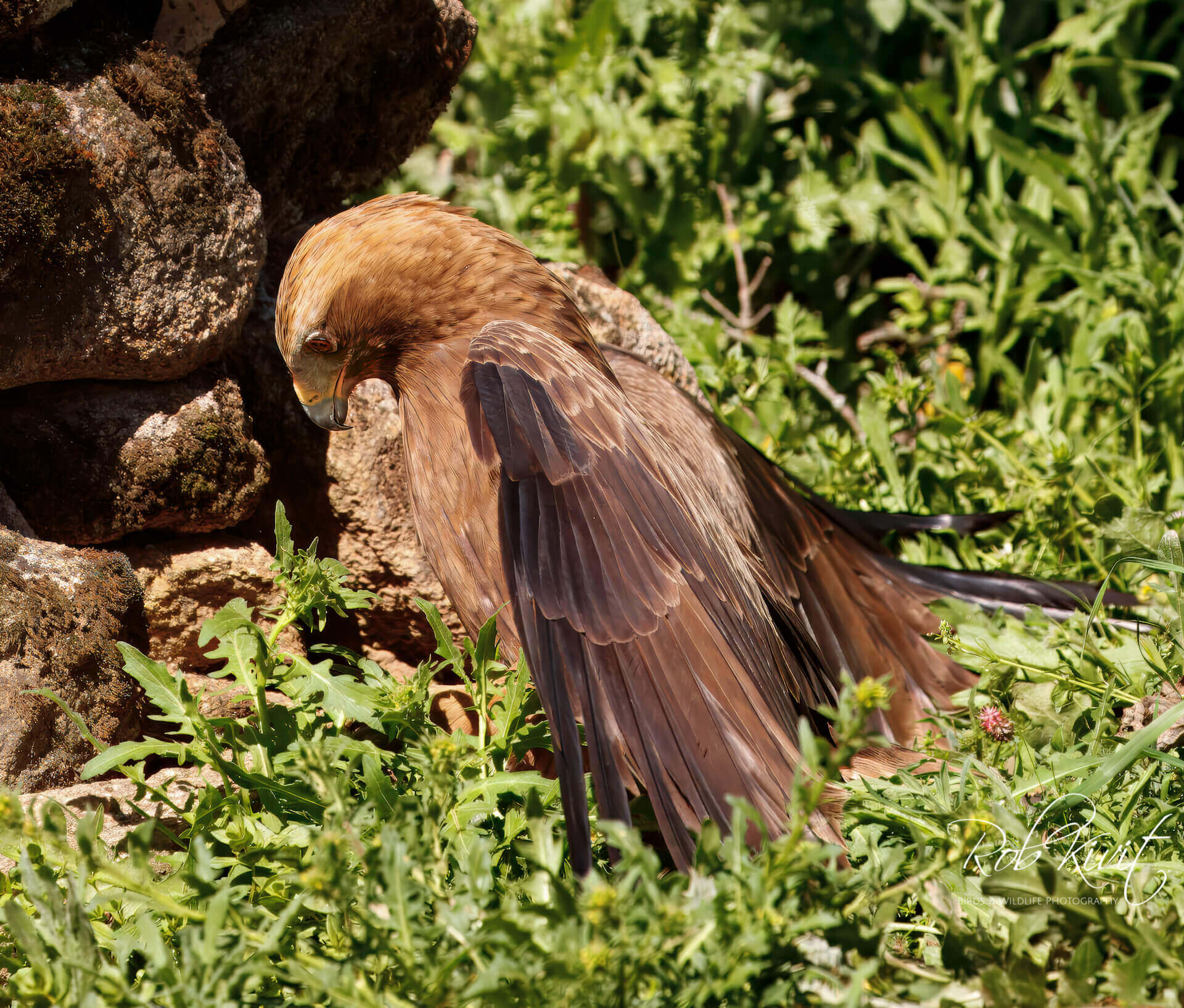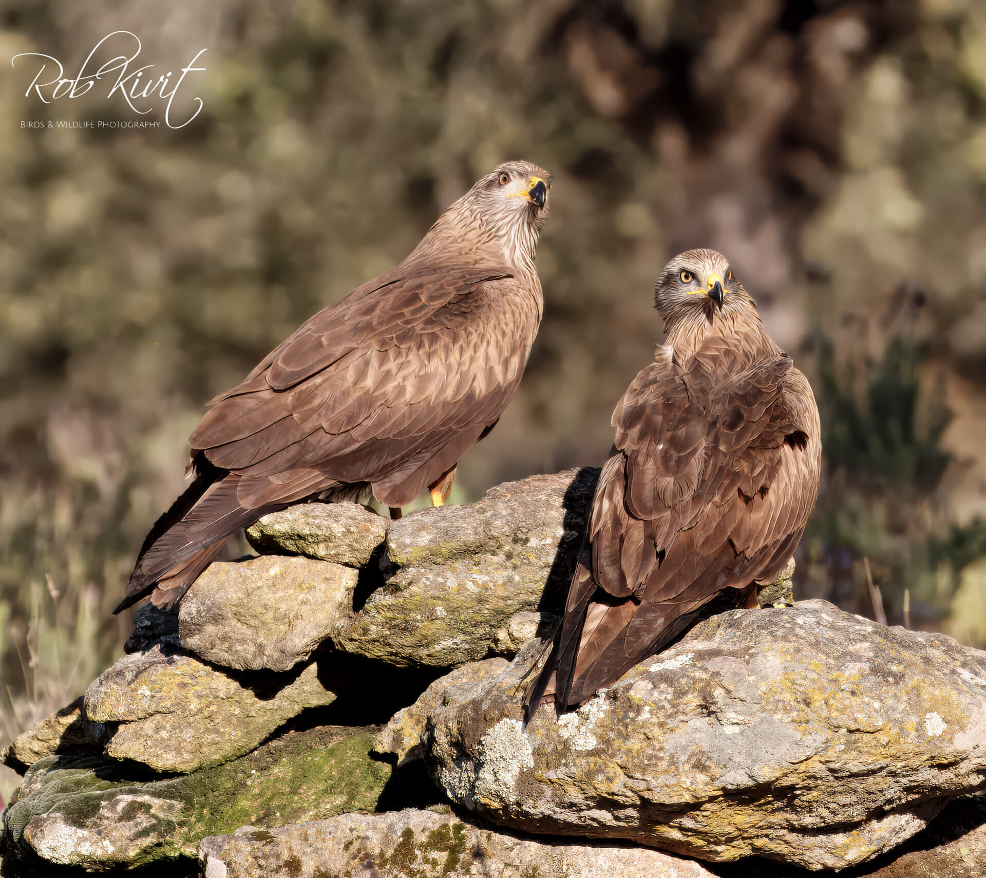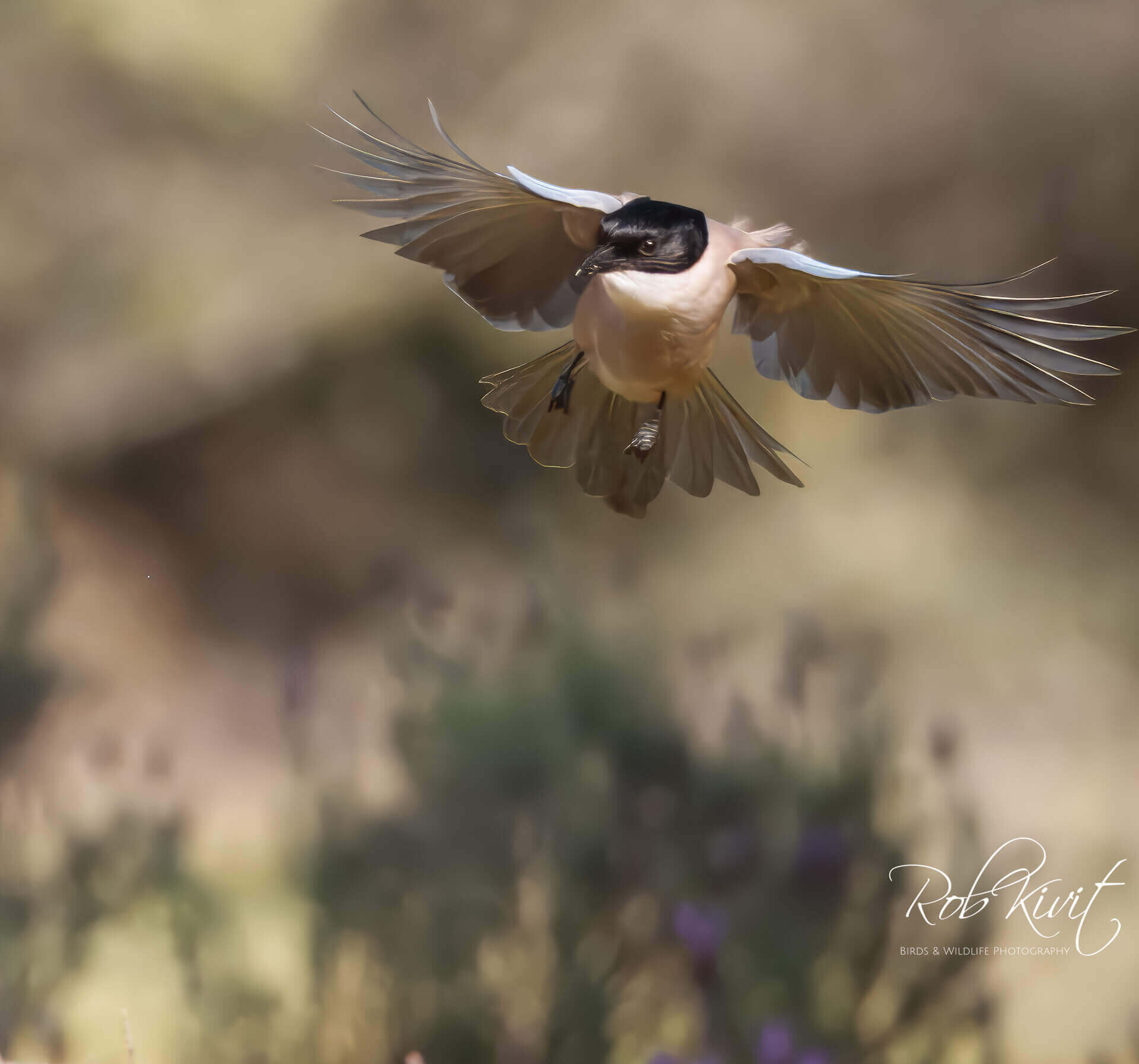 Zoals bij de meeste hutten het geval was stond ook hier de paarse lavendel en gele brem in volle bloei. Een prachtig decor als achtergrond voor het maken van mooie vlucht foto’s van vechtende kites en een paartje blauwe eksters. We zaten nog maar net in de hut of de eerste wouwen scheerden al over de hut. Dat blijft zo ongeveer voor een uur totdat het lokvoer opgegeten is en de kites zich steeds meer terugtrekken in de nabij gelegen bomen. Naast de zwarte wouwen waren ook nog rode wouwen aanwezig. Een mooi schouwspel om te zien maar doordat ze zo beweeglijk zijn en nauwelijks op de grond landen is het best wel lastig om goede vlucht foto’s te maken. Gelukkig zaten er nog een aantal acceptabele foto’s tussen.