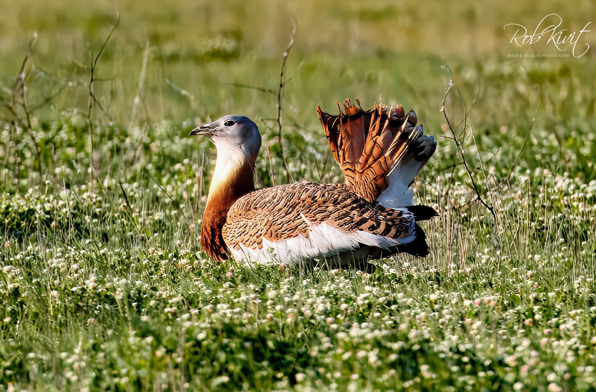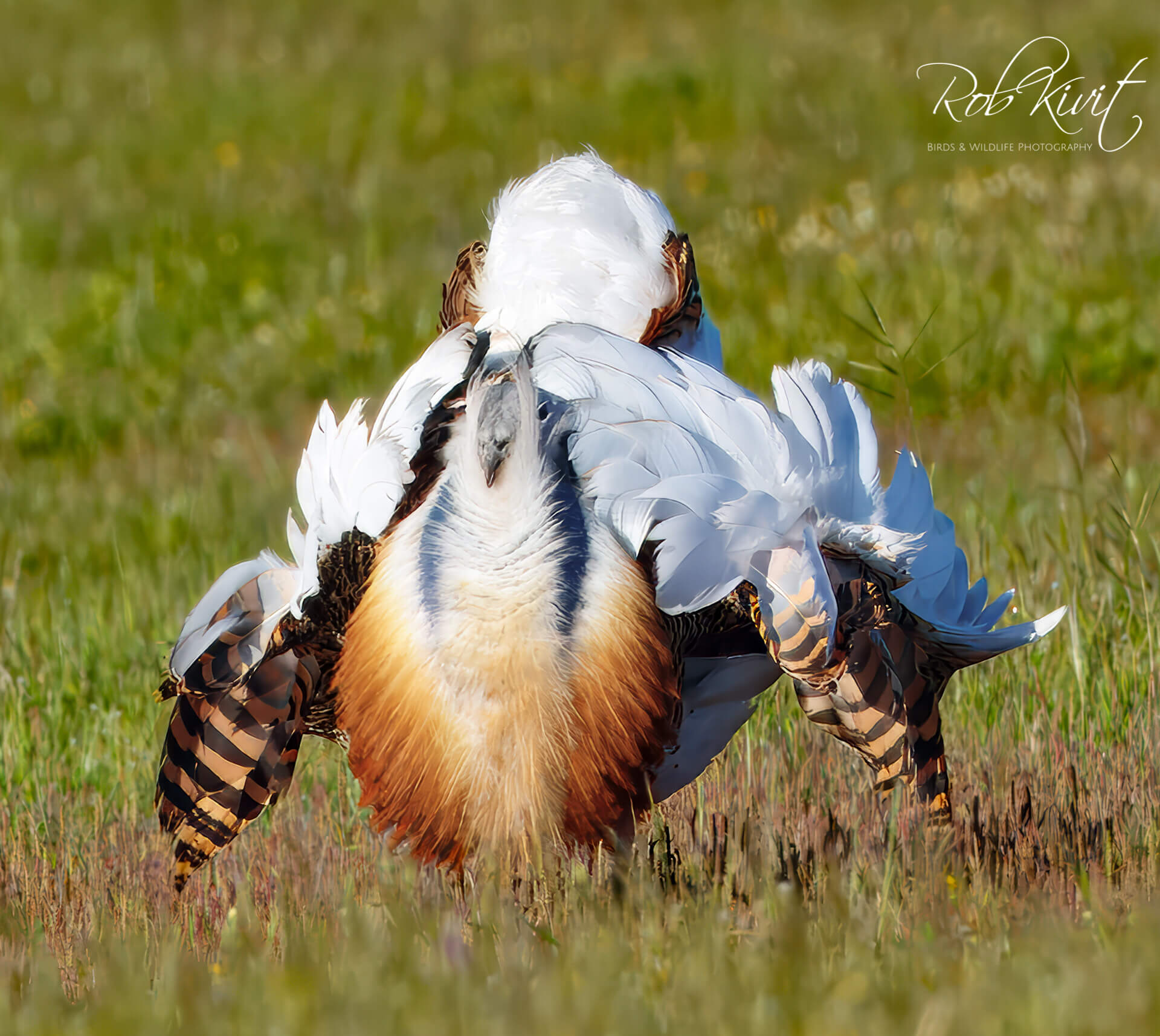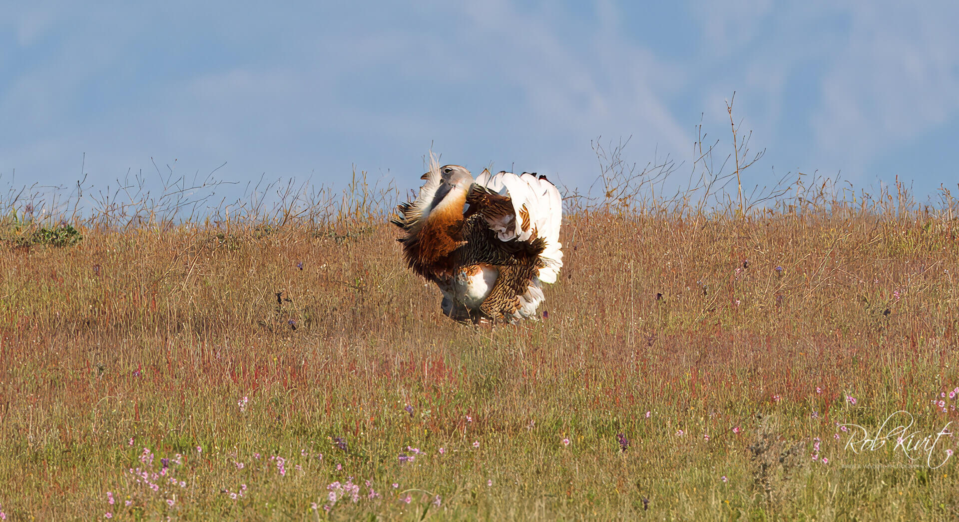 De afstand vanaf de hut tot de grote trap is veelal wel groot. Je moet echt het geduld opbrengen om de trap wat dichterbij te laten komen om daarna een foto te maken. Eerder afdrukken kan ertoe leiden dat de trap nog verderaf in het veld gaat staan. Op een gegeven moment kwamen de trappen langzaam dichterbij waarbij er eentje flink aan het baltsen was naar het vrouwtje toe die er overigens niet of nauwelijks aandacht aan besteedde. Echt een heel mooi schouwspel een baltsende grote trap met al zijn verenpracht die zich van al z’n mooie kanten liet zien. Op een gegeven moment zijn ze er klaar mee, lopen nog wat te grazen en duiken daarna het gras in.