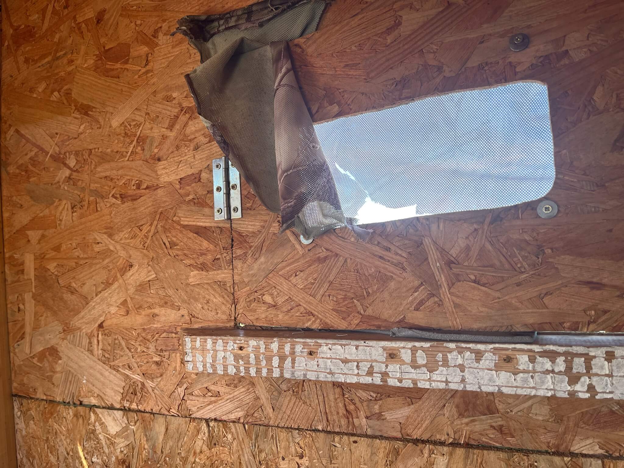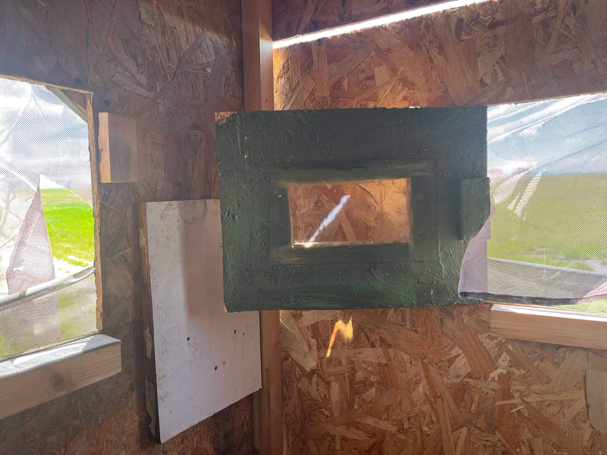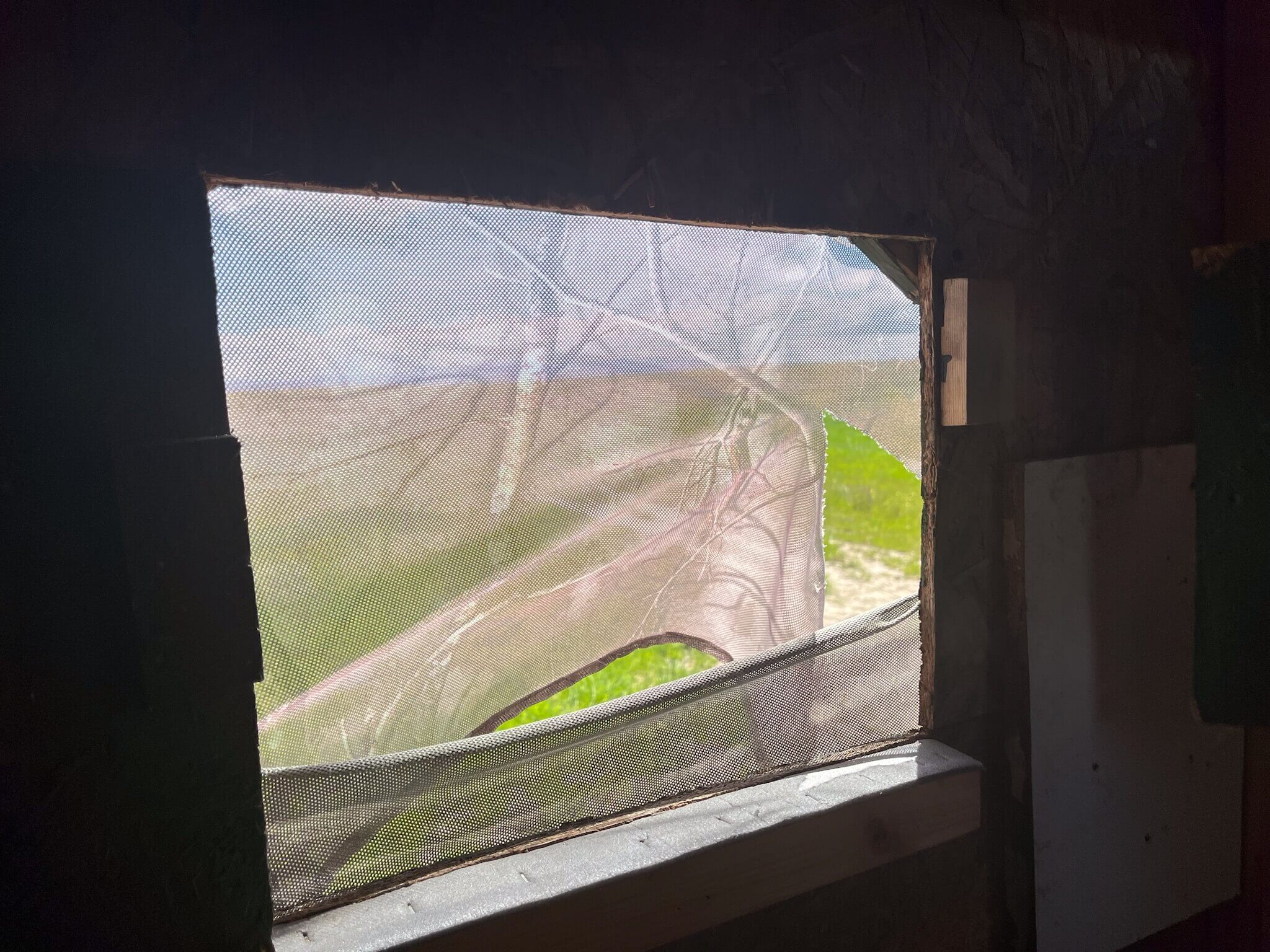De hut is eenvoudig en klein van opzet en zo’n 1x1 meter en ongeveer 1.80 hoog. Het zijn eenpersoons hutten en liggen verdeeld over het veld met een onderlinge afstand van ongeveer 100 mtr. Je moet je eigen statief met schommelkop meenemen. De ruimte in de hut is zeer beperkt en het is daarom verstandig om alleen je lens, camera, statief en schommelkop mee te nemen. Ruimte voor grote fototassen is er nauwelijks en helemaal als je door de verschillende luikjes naar buiten moet kijken waarbij je soms even moet gaan staan. Vanuit de hut kun je van alle kanten door luikjes kijken om de trappen te volgen. Je kijkt niet door spiegelglas maar rechtstreeks door een stuk gaas naar buiten. Ook je telelens zal je door dit venster moeten steken om foto’s te nemen.