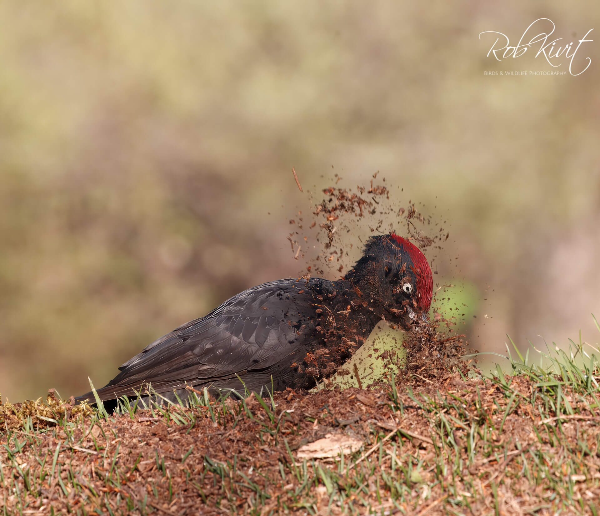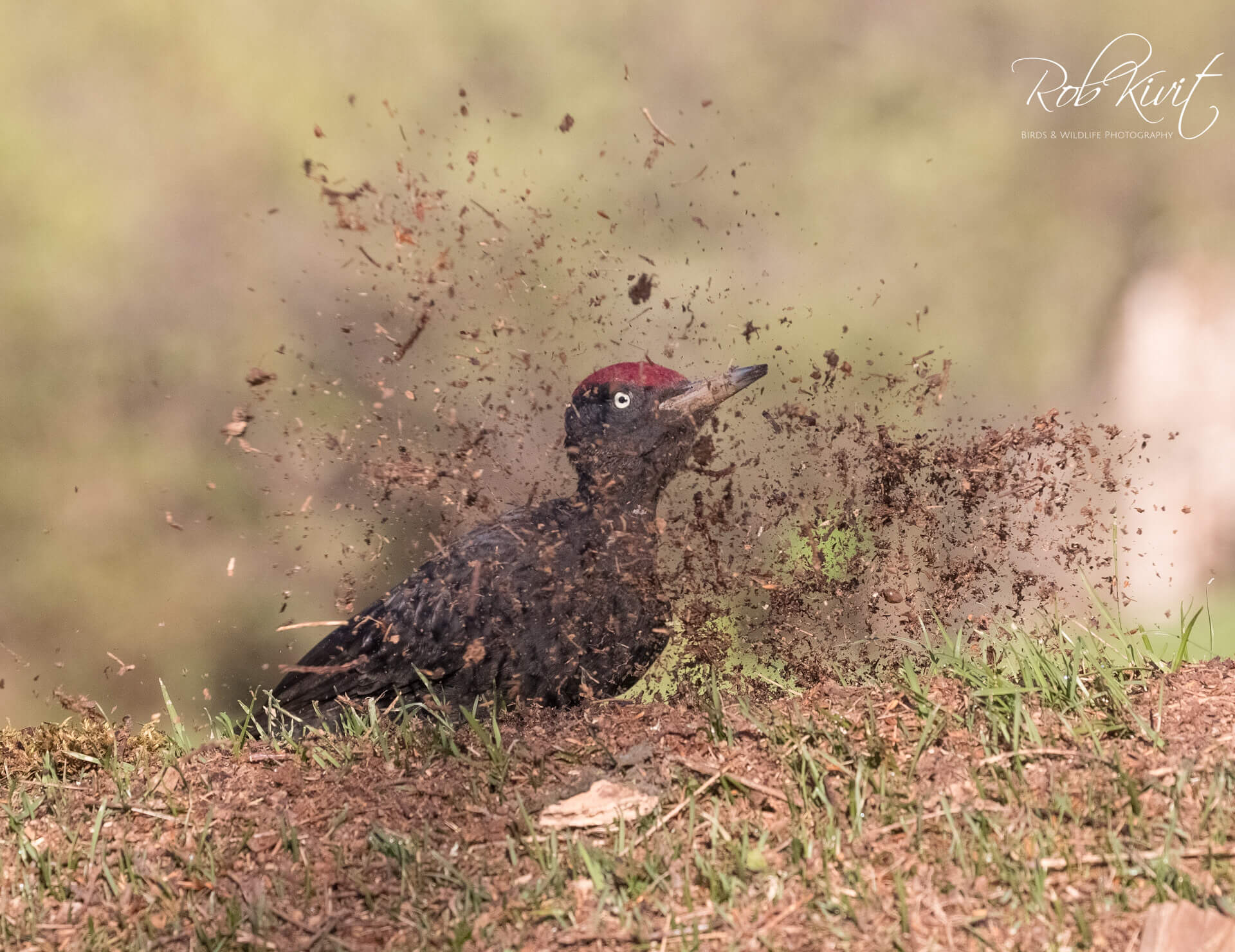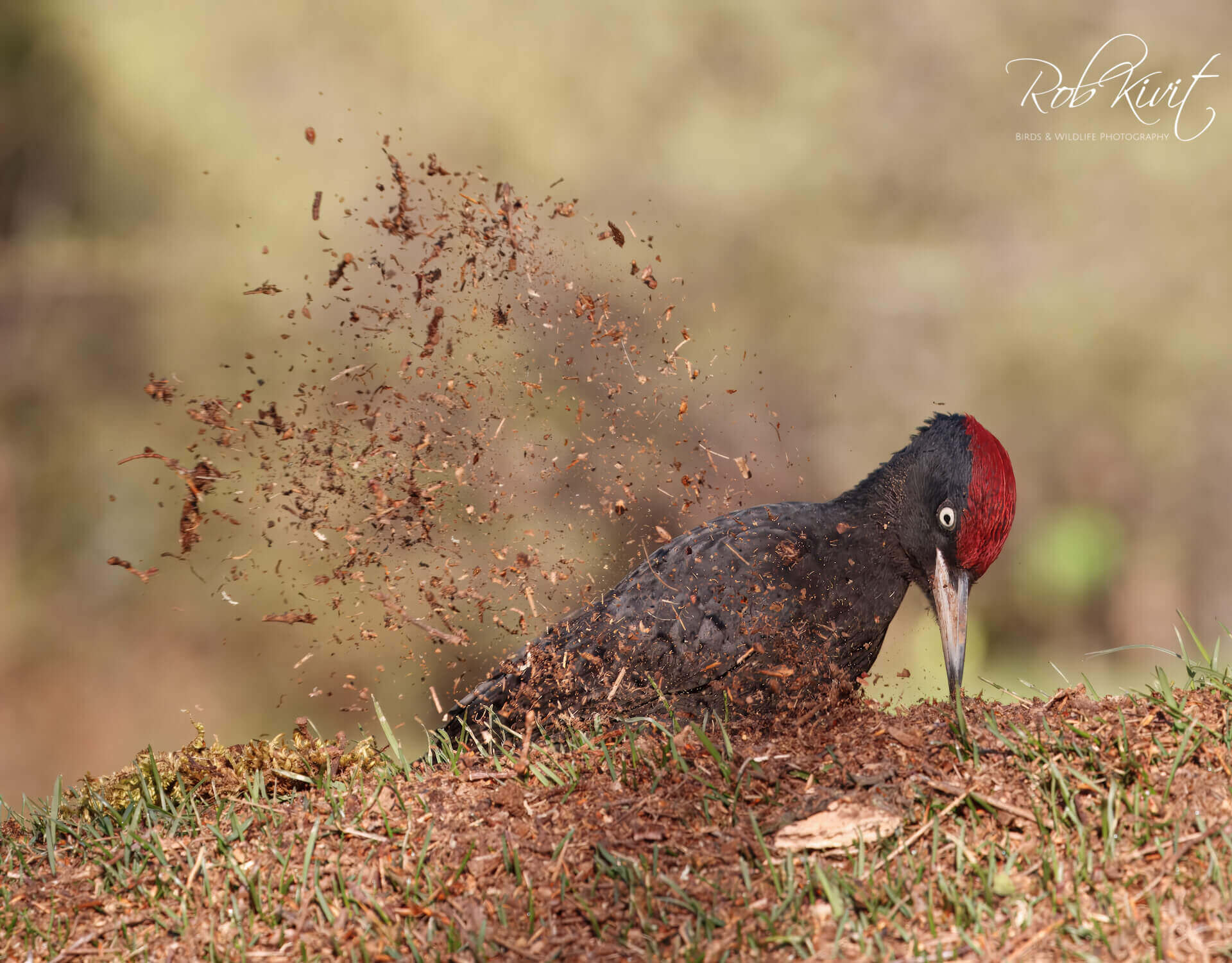 Eenmaal in de hut duurde het nog wel even voordat deze specht kwam opdraven. We zagen en hoorden dat hij wel in de buurt was maar wilde maar niet voor de hut komen. Maar eindelijk na een aantal uurtjes te hebben gewacht kwam de zwarte specht toch eindelijk voor de hut. Met het gewoel van zijn snavel in de grond wat tot opvliegende aarde zorgde kon ik leuke foto’s nemen. Naast de specht liet ook een koppeltje gekraagde roodstaart zich nog zien. Ook de glanskop, winterkoninkje en middelste bonte specht lieten zich goed fotograferen tegen het mooie ochtend gloren. Een mooie ervaring om mee te maken