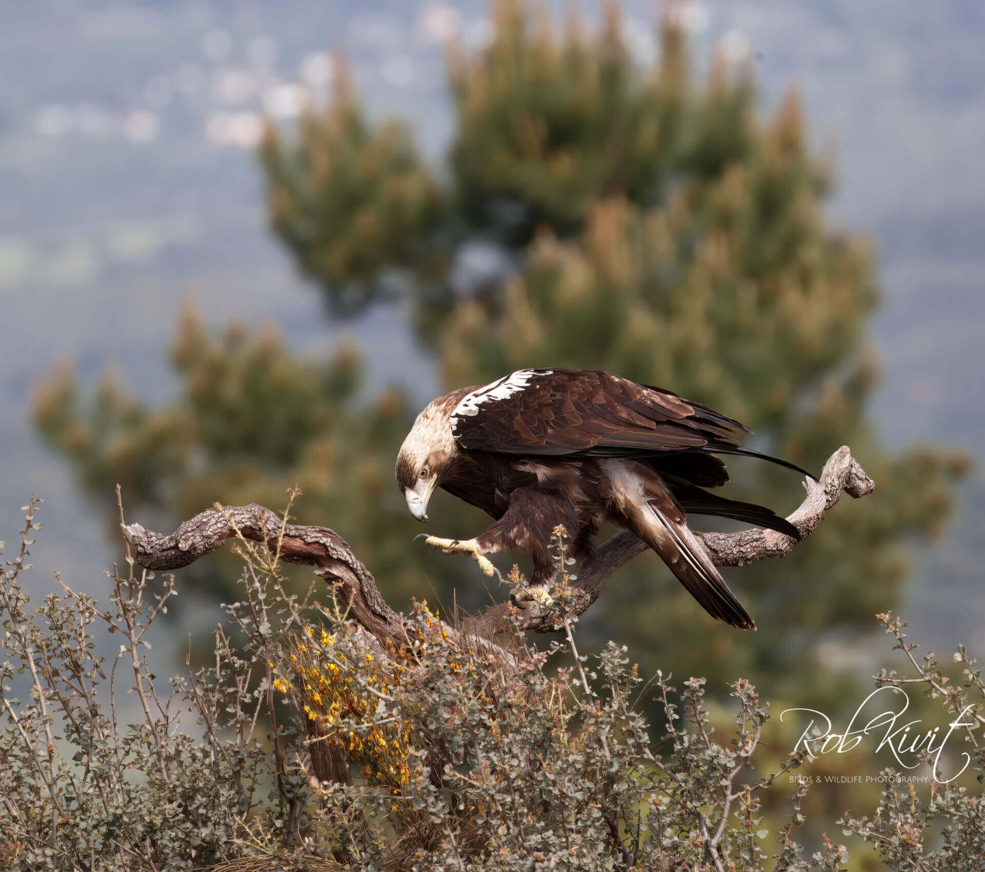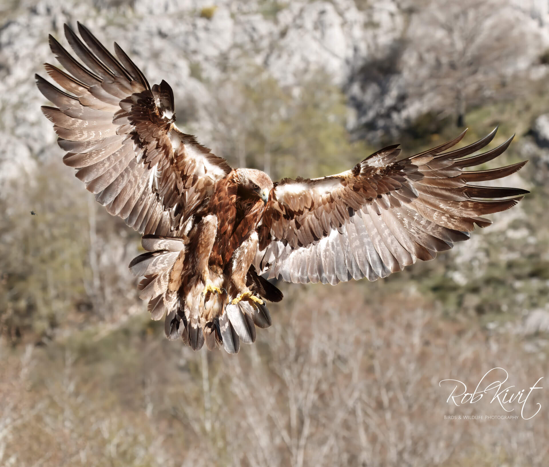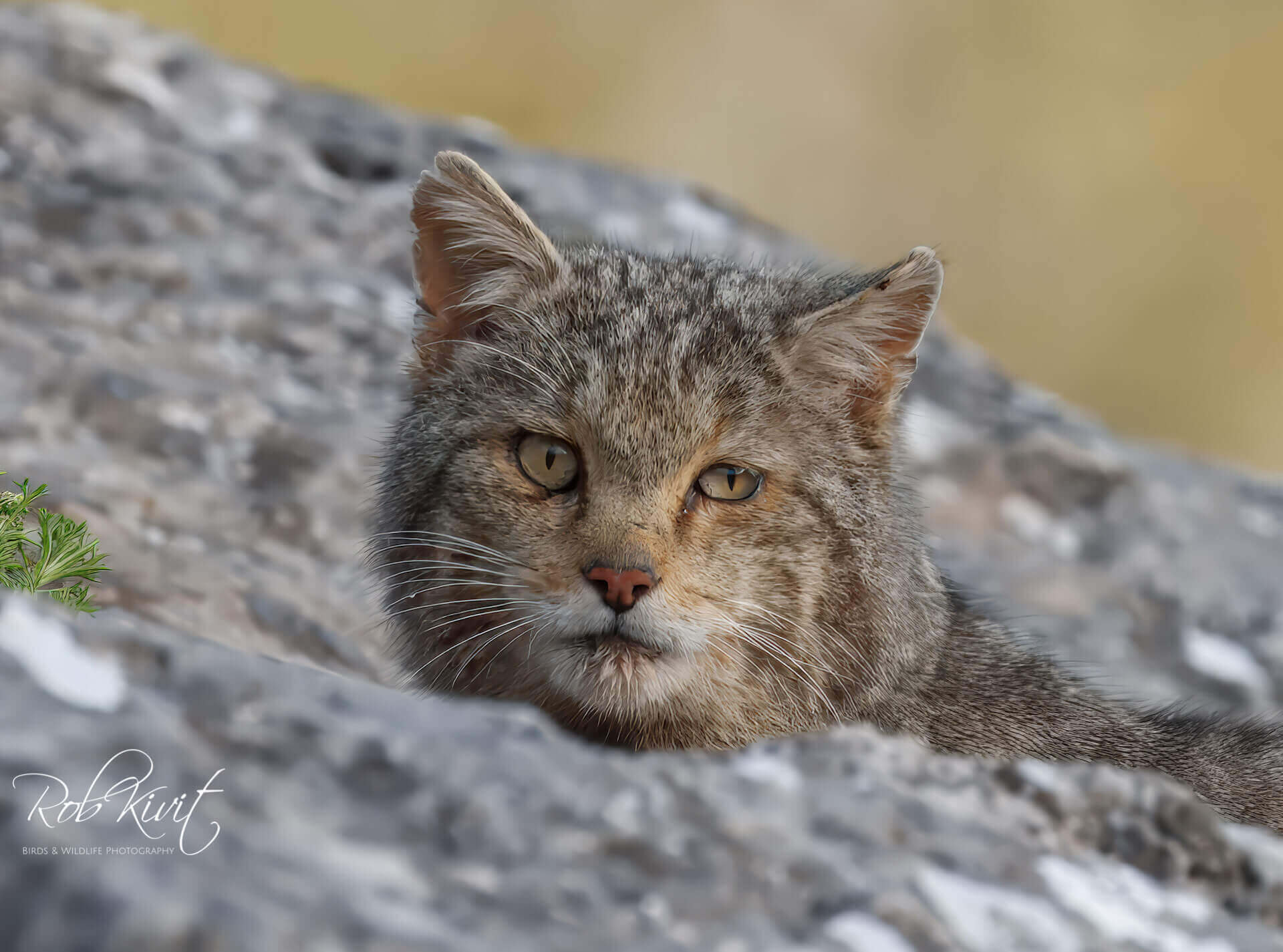 We zaten eigenlijk net goed in de hut toen de wild cat zich al liet zien in het begin was ik wel wat sceptisch over deze wildcat want als ik thuis de tuin inloop dan wordt ik bijna overvallen door al die loslopende katten. Dus waarom helemaal naar Spanje als ze in je tuin ook komen Toch ziet een wildcat er wel degelijk anders uit dan een gewone huiskat. Als je goed kijkt naar zijn dikke vacht, kop en vooral de staart dan zie je duidelijk verschillen met een huiskat. Het was desondanks erg leuk om zo’n kat in het wild te fotograferen. Niet veel later kwam ook de steenarend vanuit het niets op de setting landen. Een mooie gewaarwording en heb van de landing nog een paar leuke foto’s kunnen maken.