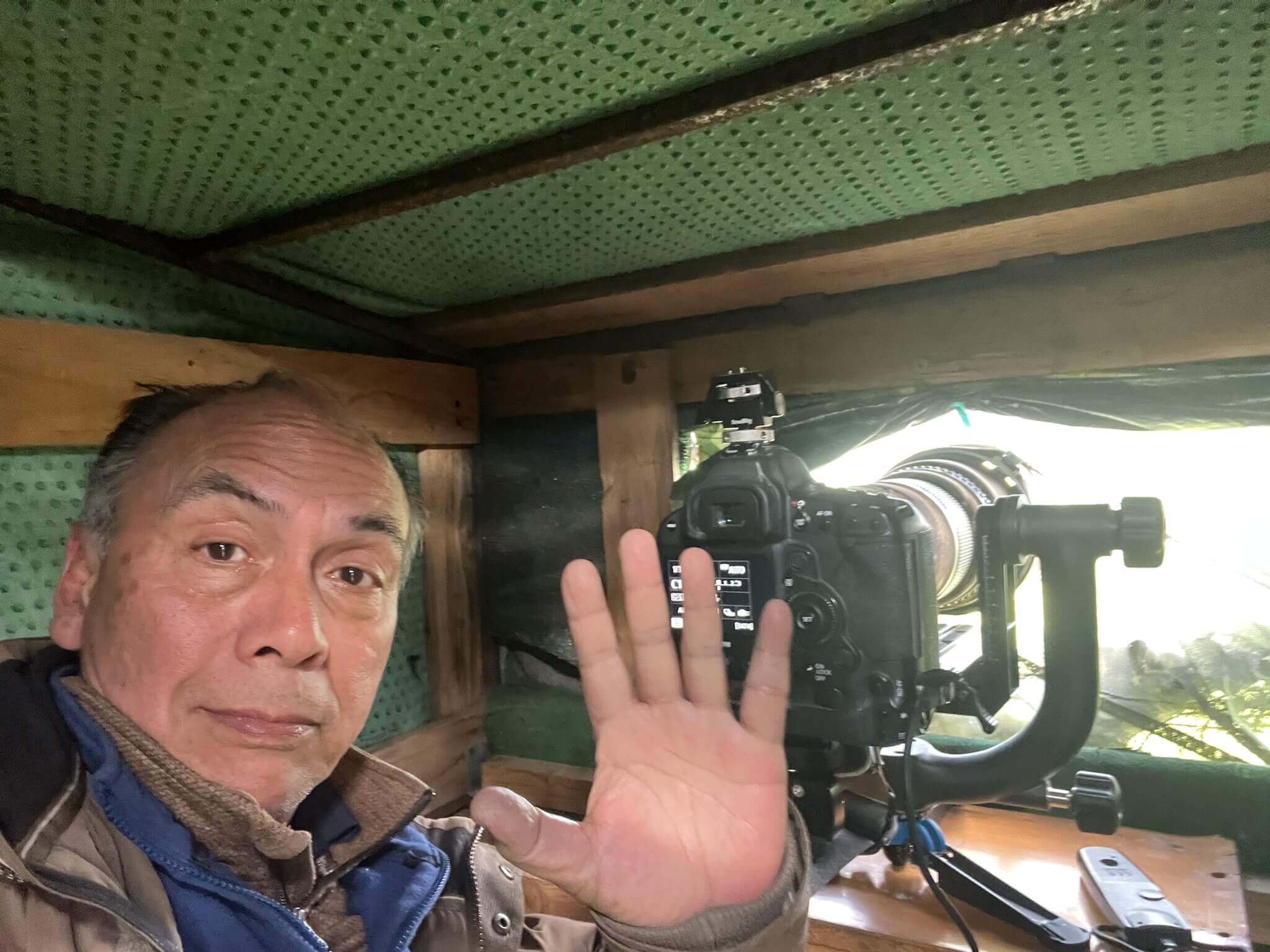 Neem alleen fotoapparatuur mee die je nodig hebt en laat de rest zoals rugtassen e.d. achter in je hotel. De ruimte in de hut is zeer beperkt en zeker met de grote trap heb je die ruimte nodig om je te kunnen bewegen omdat de hut uit 4 luikjes bestaat waardoor je de trappen in de gaten kunt houden. Ikzelf heb alleen mijn camerabody plus lens meegenomen. Een tripod statief is niet bruikbaar maar mogelijk wel een monopod.